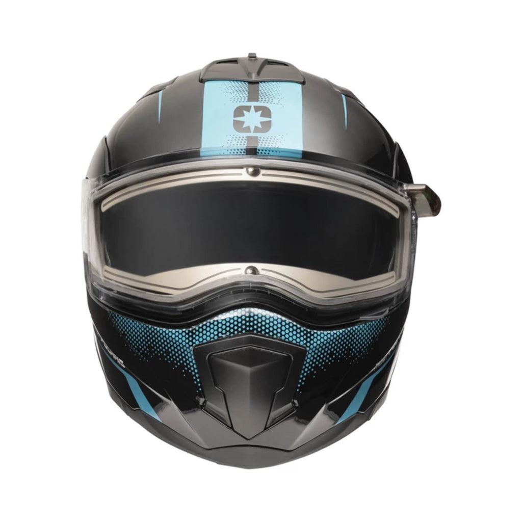 Our updated Modular helmet offers a great fit, updated graphics, and a variety of features. The quick release breath guard directs hot air down and out of the helmet to reduce fogging while the chin guard seals out cold air and snow dust. The tough and sleek injection-molded shell is engineered for cutting edge style and airflow making this helmet incredibly quiet. You're always ready to ride with the articulating chin bar which allows you to keep your helmet on. Stop to talk, have a drink of water, and always stay warm. An integrated flip-down electric shield adds the convenience of sun and glare protection to your vision while a Proclip quick release chin strap allows you to fasten the chin strap in just seconds. The dual-pane shield is coated for maximum fog and scratch resistance for superior vision in any weather condition.